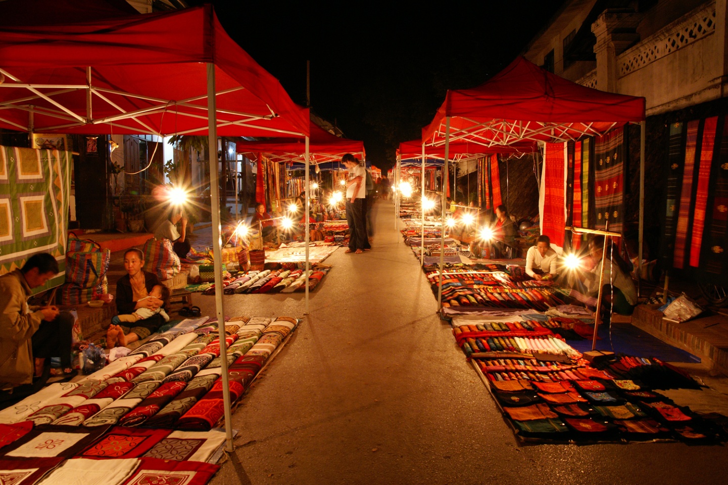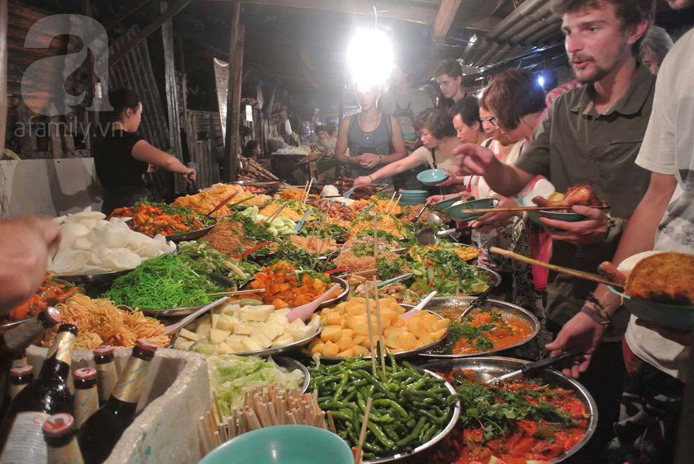 - Chợ đêm Luang Prabang: Di chuyển từ Vientiane đến Luang Prabang bằng tàu đường sắt tốc độ cao, đến LPB cũng đã là 7h tối nên mình về tắm rửa qua rồi tạt qua chợ đêm với mục đích ăn tối và xem có món nào hay hay để mua về làm quà. Chợ đêm ngày nào cũng mở, theo mình quan sát thì nó phân thành 2 khu: khu buôn bán và khu ăn uống. Khu buôn bán sẽ chủ yếu có quần áo, quà lưu niệm, vật dụng,...Khu ăn uống tất nhiên sẽ bán đồ ăn, có đủ các món trên đời từ Đông sang Tây. Ngoài ra, ở giữa có rất nhiều bàn để mọi người mua đồ ăn xong thì mang ra ngồi tụ tập. Khu này cực đông khách Tây, kiểu mọi người vừa ăn vừa trò chuyện tạo nên bầu không khí khá náo nhiệt.